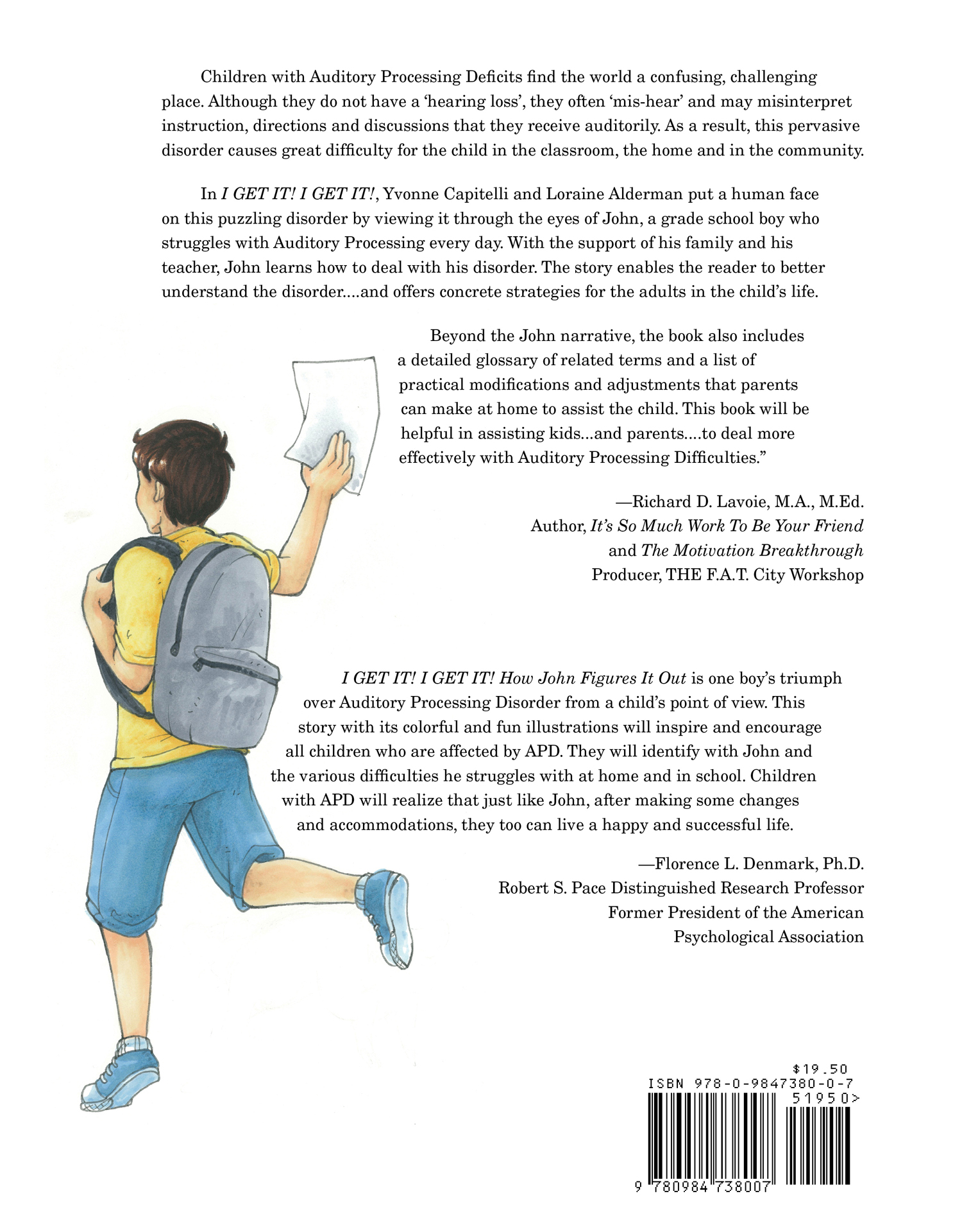 In I GET IT !! I GET IT !!, Yvonne Capitelli and Loraine Alderman put a human face on this puzzling disorder by viewing it through the eyes of John, a grade school boy who struggles with Auditory Processing every day. With the support of his family and his teacher, John learns how to deal with his disorder. The story enables the reader to better understand the disorder....and offers concrete strategies for the adults in the child's life.